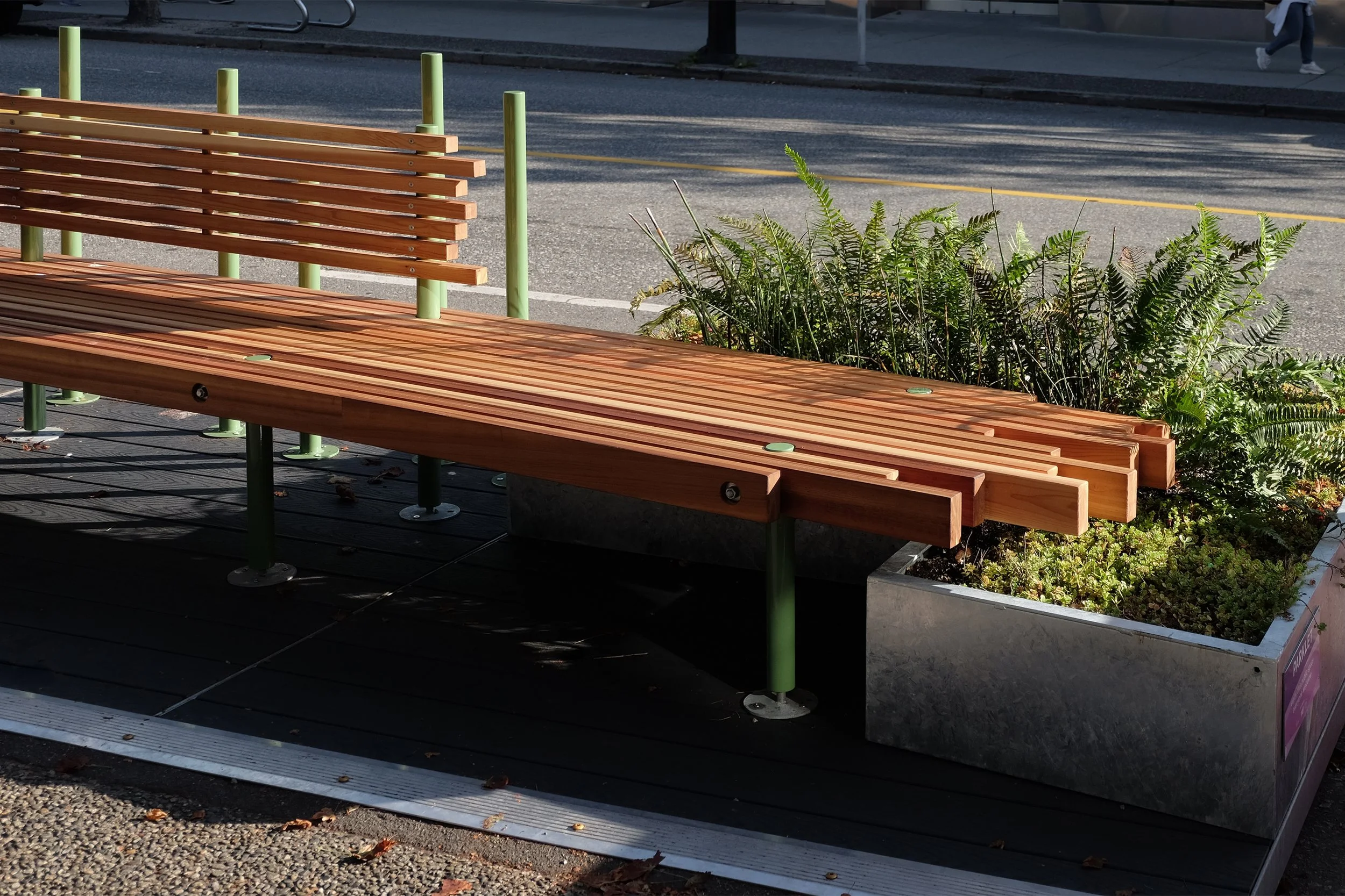 Since its completion in August 2019, Urban Pasture 2.0 has become the largest parklet in City of Vancouver, featuring the longest curvilinear bench on Robson Street. The design draws inspirations from the ubiquitous park benches that are often long and sinuous along footpaths. What distinguishes Urban Pasture from its peers is the uninterrupted seating facing the sidewalk, with no tables provided. This strategy is a reversal of conventional outdoor patio design, which is often regarded as merely an extension of private business premises, especially serving restaurant or café patrons. Imu Chan and Team seek to create a democratic, inclusive public space where personal respite and casual encounter can simultaneously occur.