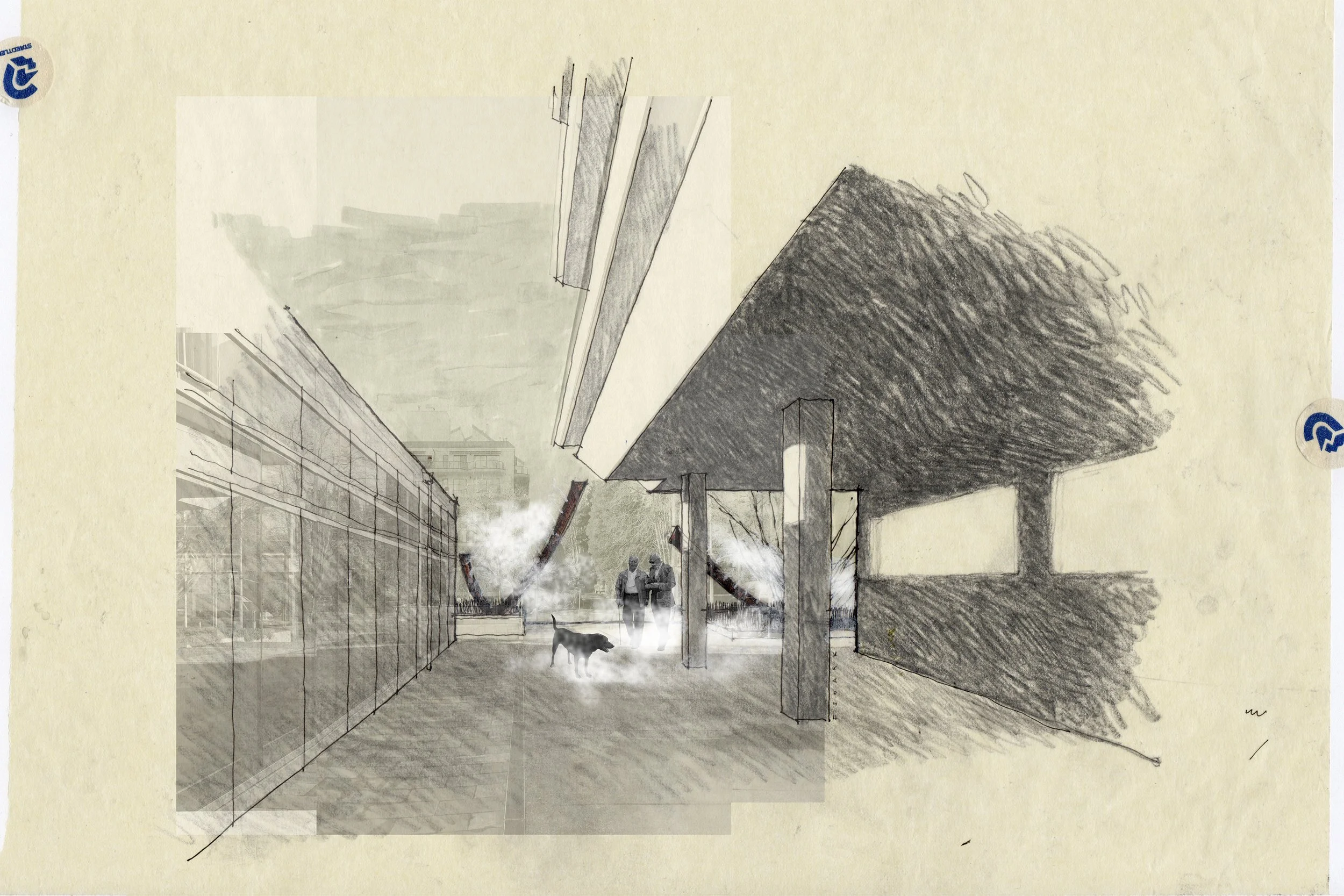 The curvilinear profile and levitating gesture of the public art not only reference the natural geography of West Vancouver, they counterbalance the orthogonal, static architectural space - currently dominated by the remnants of an arcaded façade, overshadowed by cantilevered slabs. The arcs are slightly tilted to create an anticipation of movement, gently guiding the visitors toward the entrance door. They are made of weathering steel; the material mass juxtaposes with the lightness of fog. They sit at the two landscaped areas flanking the entry steps, so that the mist may also nourish the surrounding plants.