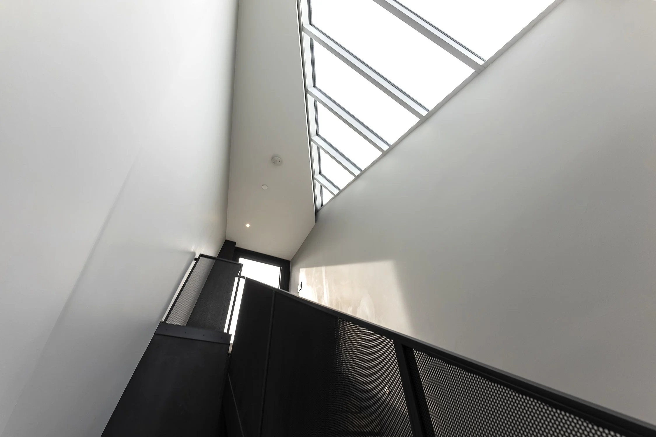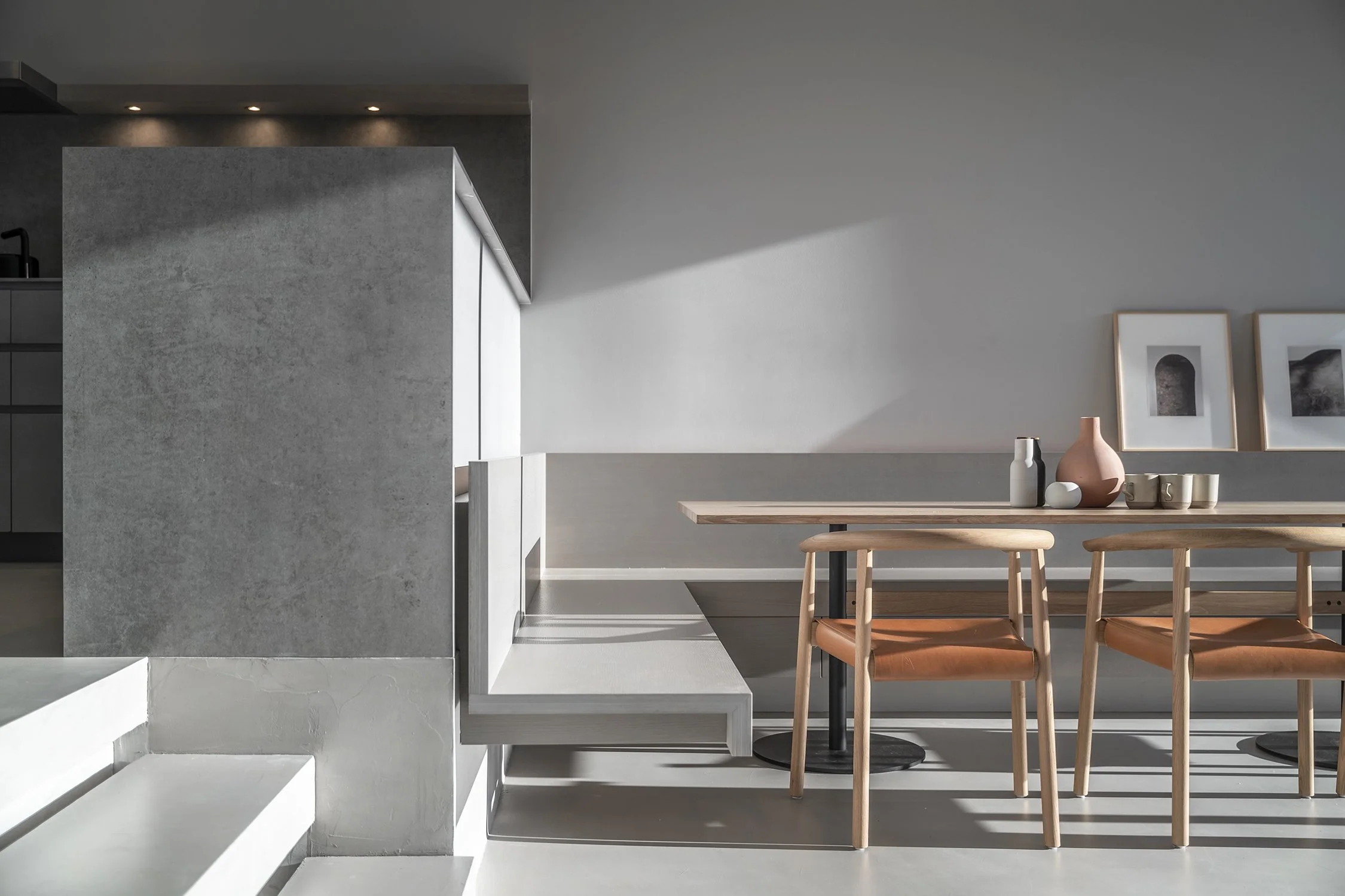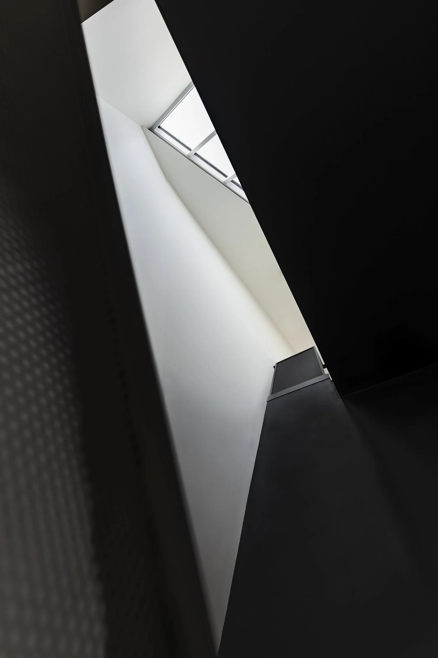 The concrete path enters onto a small landing. There, a glimpse through a series of muted spaces leads onto a larger landing, then steps down onto another one, widening at each descent, taking the eyes and then the feet through moments suspended between geometric horizons, before slipping away, sunken without a trace.