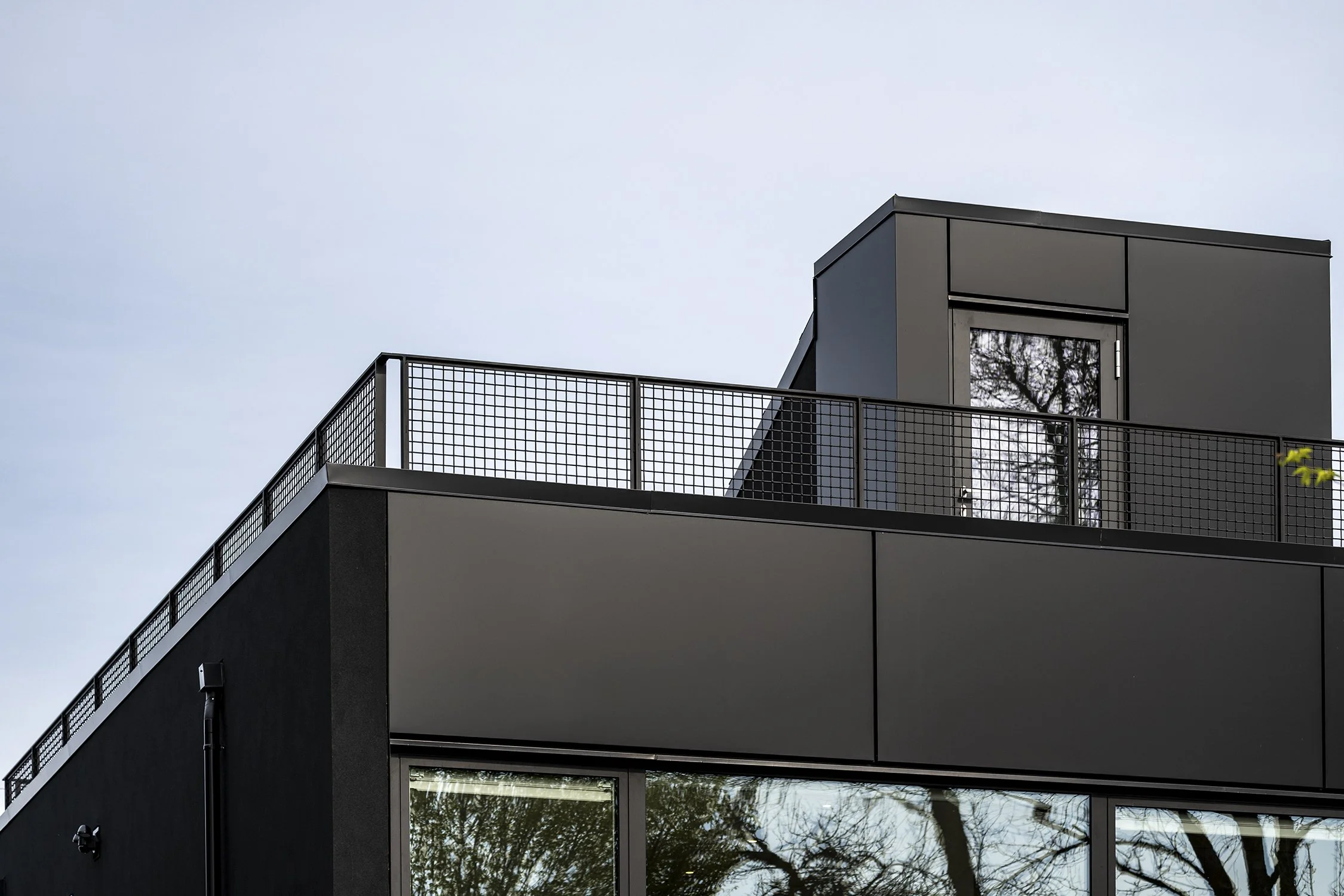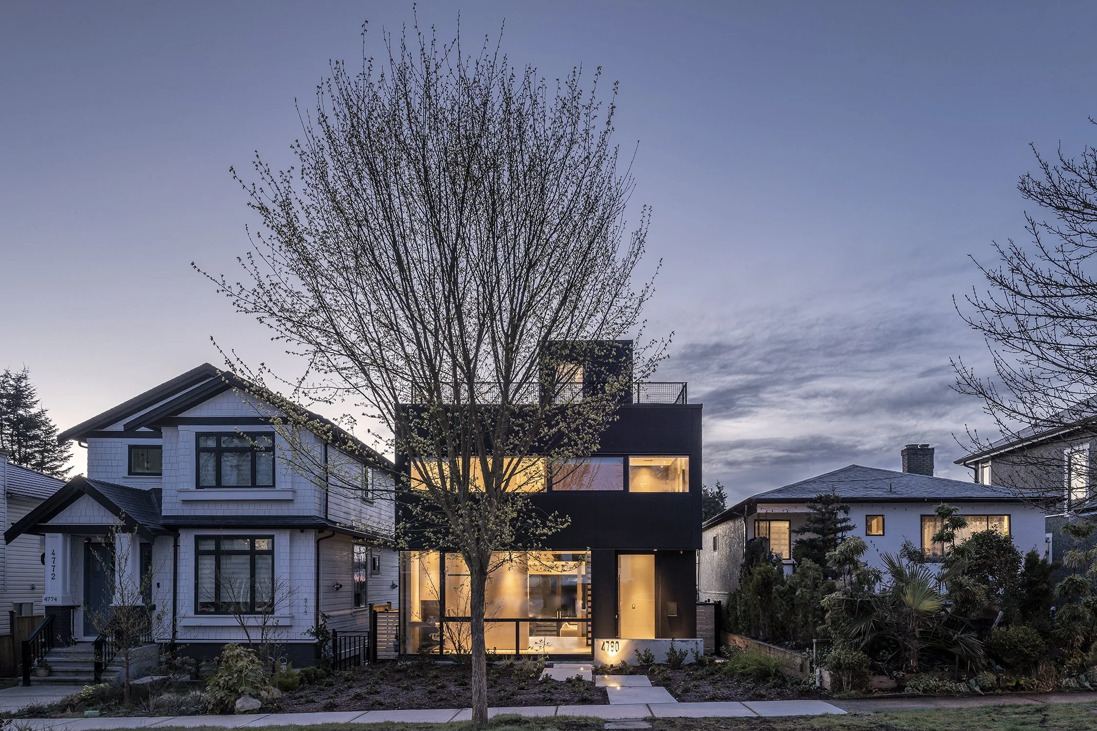 The house sits in an urban lot like a black monolith in silent repose. From its solemnity a corner is receded, yielding to an approaching concrete path that meanders through, a byway out from the trodden sidewalk. At its terminus is an opening, gesturing the possibility of habitation.